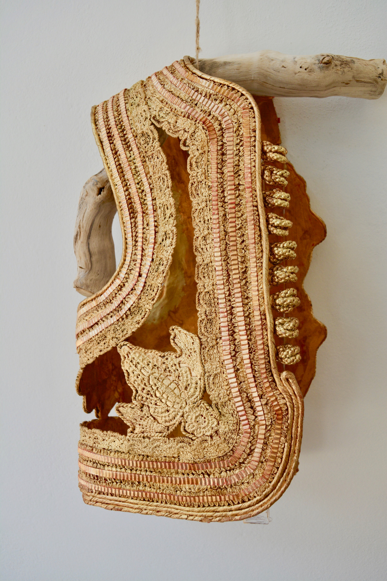 Χρησιμοποιήθηκαν απλά υλικά της καθημερινότητας—χαρτί από παλαιά δημοτολόγια του 1940-1950, σχολικά βιβλία -Ομήρου Ιλιάς, 1959- εφημερίδες, εμπορικοί κατάλογοι, κάποιες δαντέλες, φύλλα χρυσού 24 καρατίων—προκειμένου να αποτυπωθεί το μη πραγματικό: μνήμες που διαφεύγουν, ηρωικές μορφές που έχουν γίνει μύθος, ασώματες παρουσίες αυτών που ίστανται "στον κόσμο του επέκεινα".